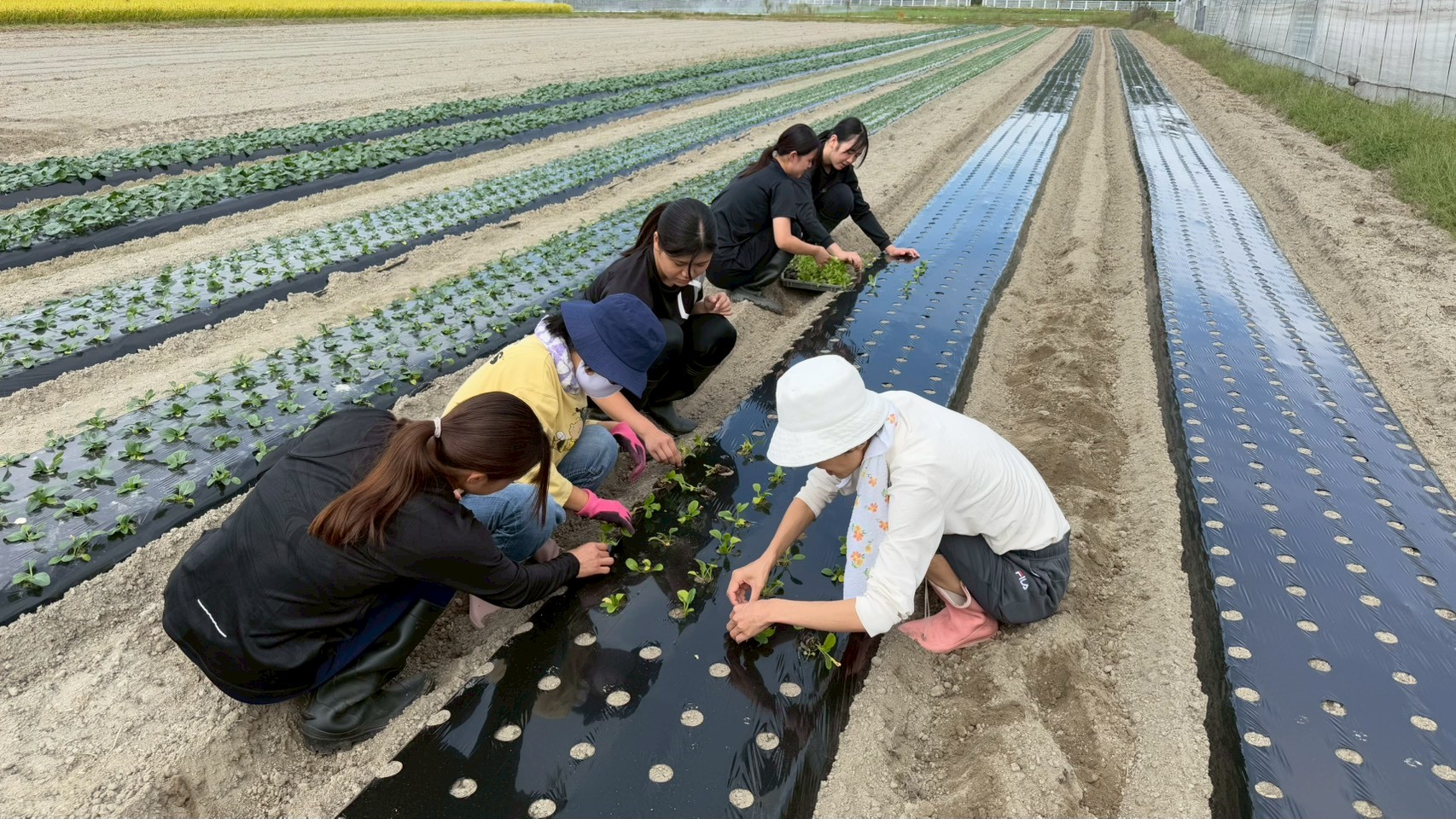 3. 【社会福祉学部】山本ゼミ・水野ゼミの学生が、赤穂市立さくら園の皆様と農福連携の取り組みで小松菜の定植作業を行いました