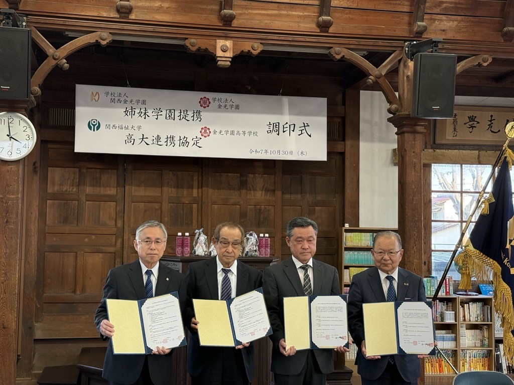 2025年10月30日(木)金光学園記念講堂にて、学校法人関西金光学園と学校法人金光学園は、両学園の友好関係を確立するために姉妹学園提携を締結しました。併せて、関西福祉大学と金光学園高校との高大連携協定の締結も行われました。