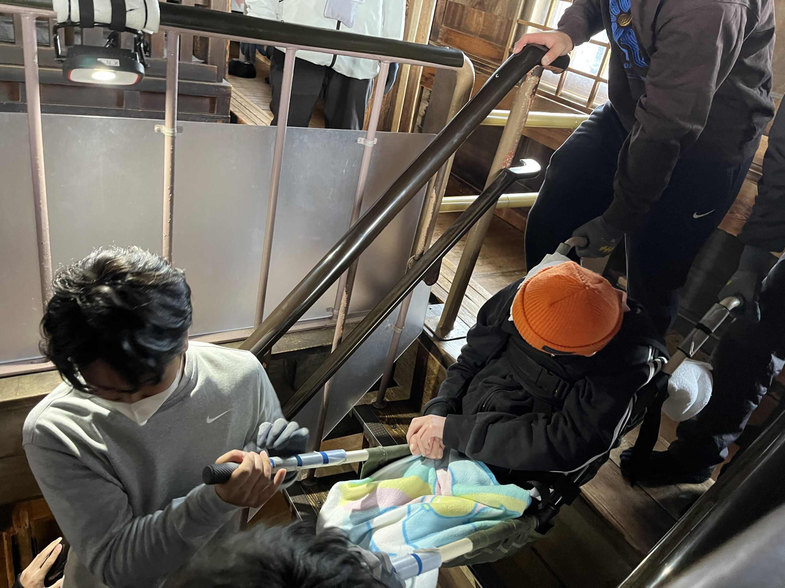 登城支援専用に作成した「いすたんか」を使って、4月から学内での搬送練習を繰り返し、赤穂市消防本部での救急隊員の方達による搬送訓練を行うなど、参加される方が安全に安心して登城できるよう準備を万全にを重ねてきました。