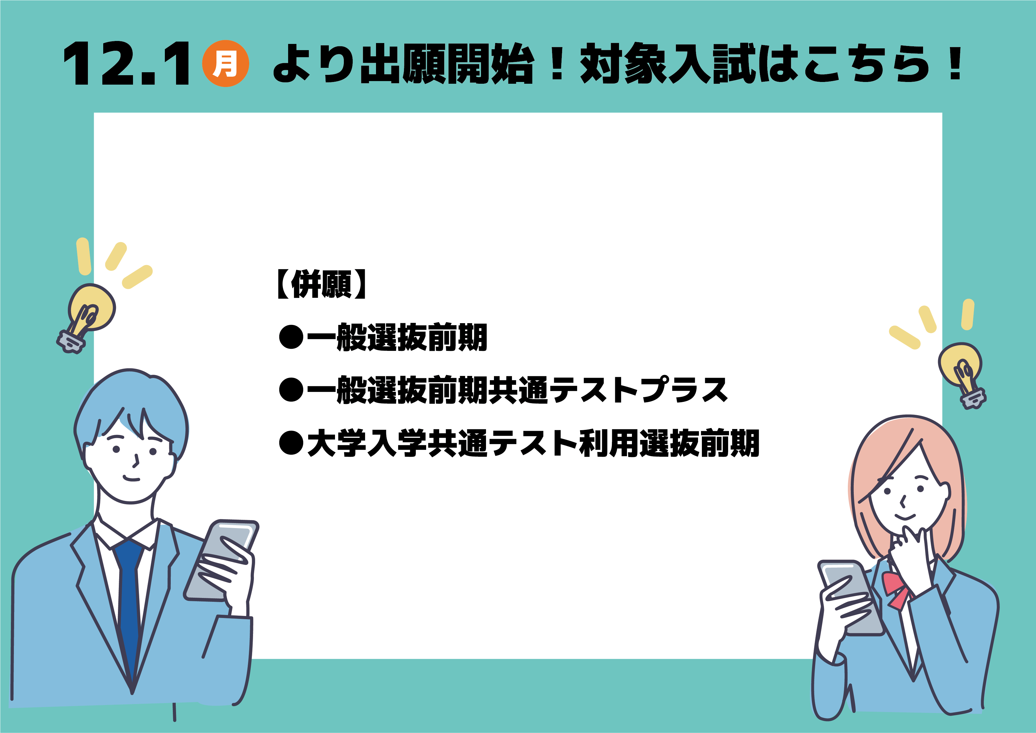 関西福祉大学では、12/1(月)より【一般選抜前期(30周年記念特待生選抜)・一般選抜前期共通テストプラス(30周年記念特待生選抜)・大学入学共通テスト利用選抜前期(共通テスト学費免除特待生選抜)】の出願を開始します。
