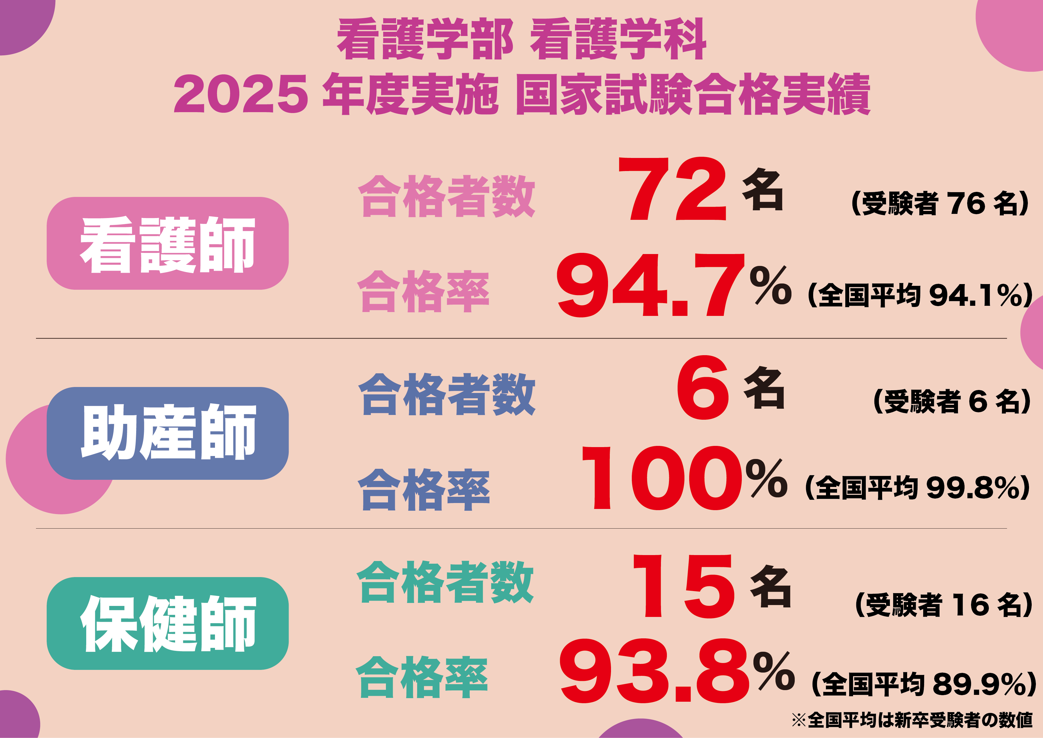 2026年3月24日(火)、第115回看護師・第109回助産師・第112回保健師国家試験の合格発表がありました。本学の結果(新卒)は以下の通りです。
